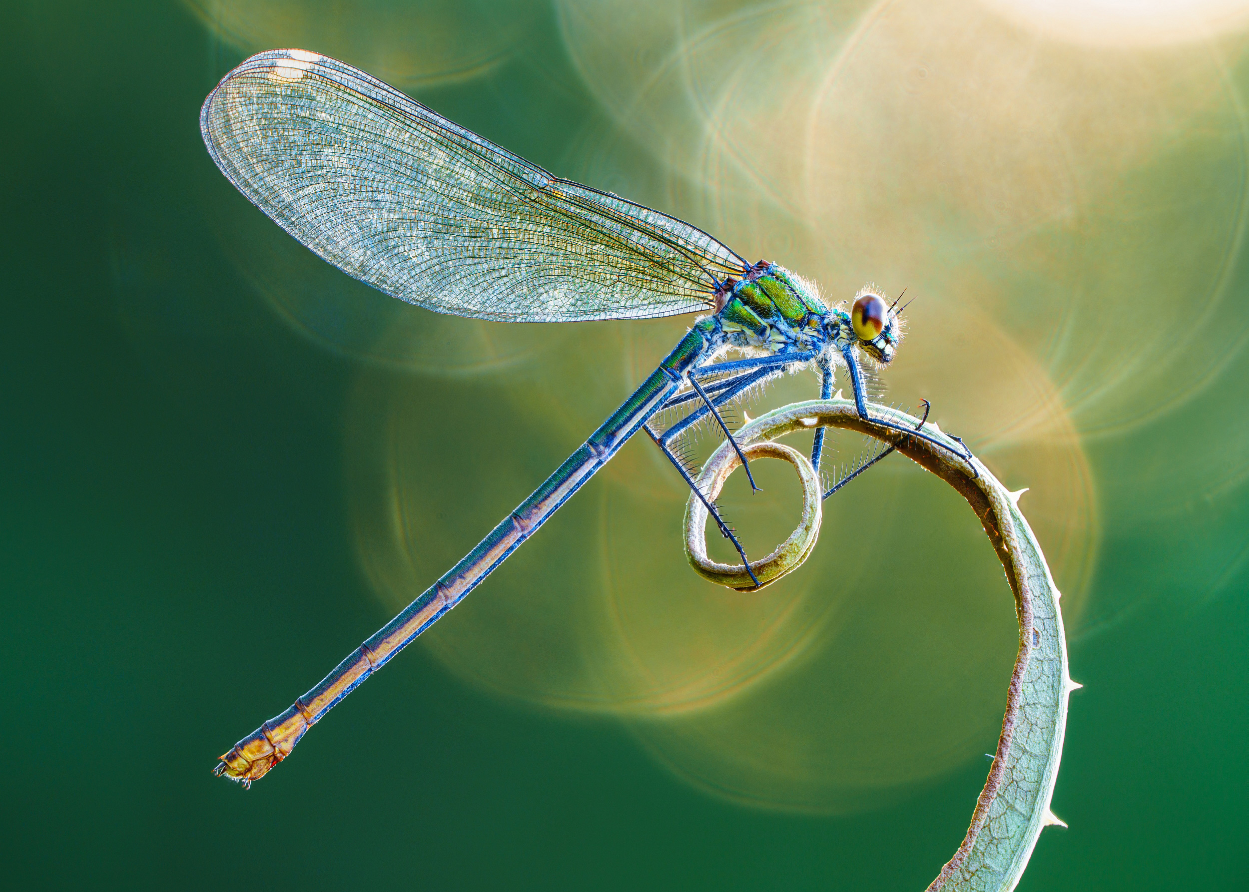 Wie für die Landschaftsfotografie sind die Bedingungen bei Sonnenaufgang auch für die Makrofotografie von Insekten ideal. Mit den ersten Sonnenstrahlen suchen sich die Insekten einen sonnigen Platz, um Wärme zu tanken. Bis sie sich aufgewärmt haben, bewegen sie sich nur langsam und reagieren träge, sodass Sie sich ihnen ungestört nähern können.