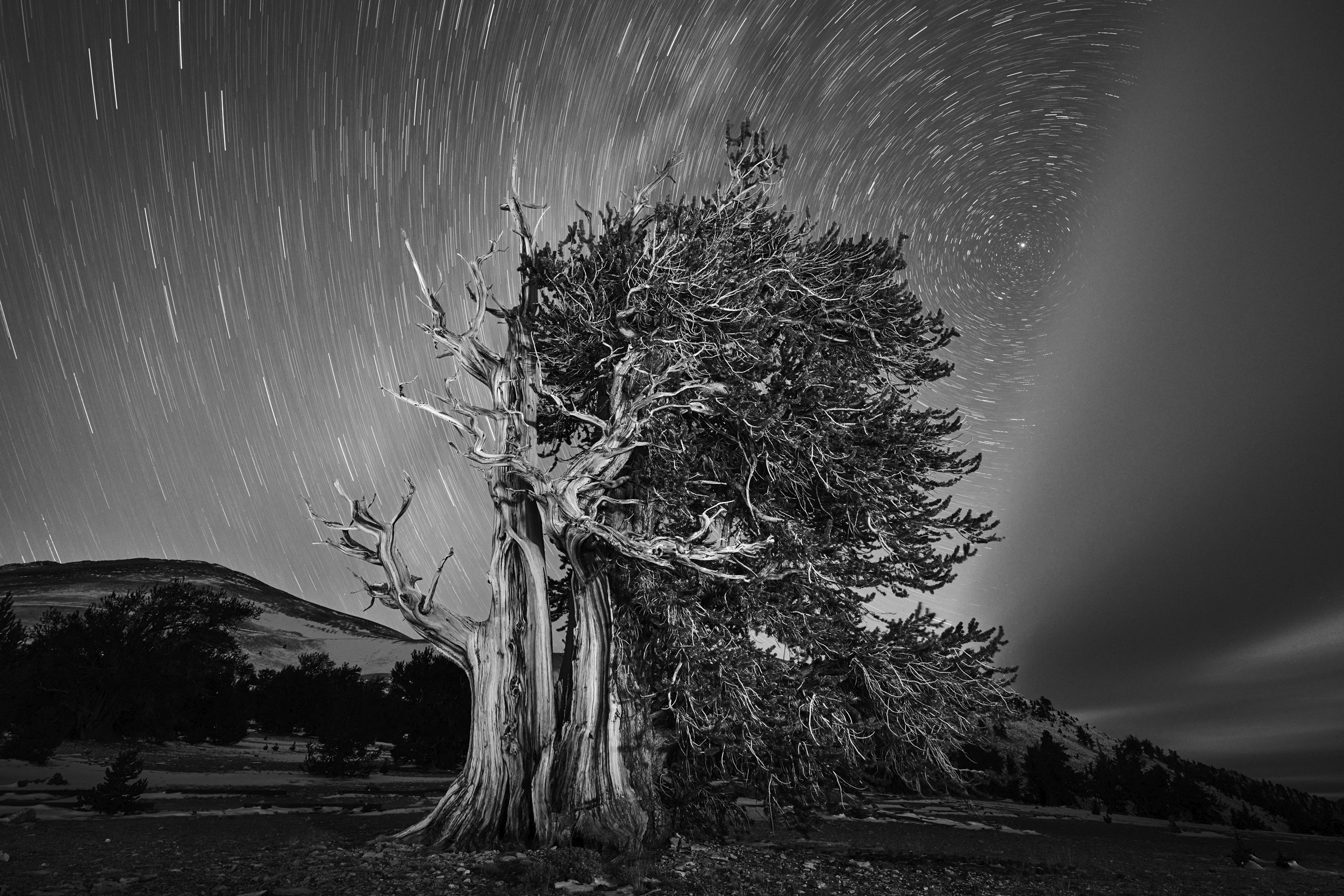 Ich stelle meine Verschlusszeit normalerweise auf 20 bis 30 Sekunden ein, weil ich nichts dagegen habe, wenn man ein kleines bisschen Bewegung in den Sternen sieht. Bisweilen finde ich, dass dadurch die traumartige Atmosphäre in meinen Bildern verstärkt wird. Außerdem hat es praktische Gründe, denn bei diesen Verschlusszeiten habe ich mehr Zeit, die Szene auszuleuchten, und kann eine vernünftige ISO-Einstellung verwenden, zum Beispiel ISO 3200 oder 6400.