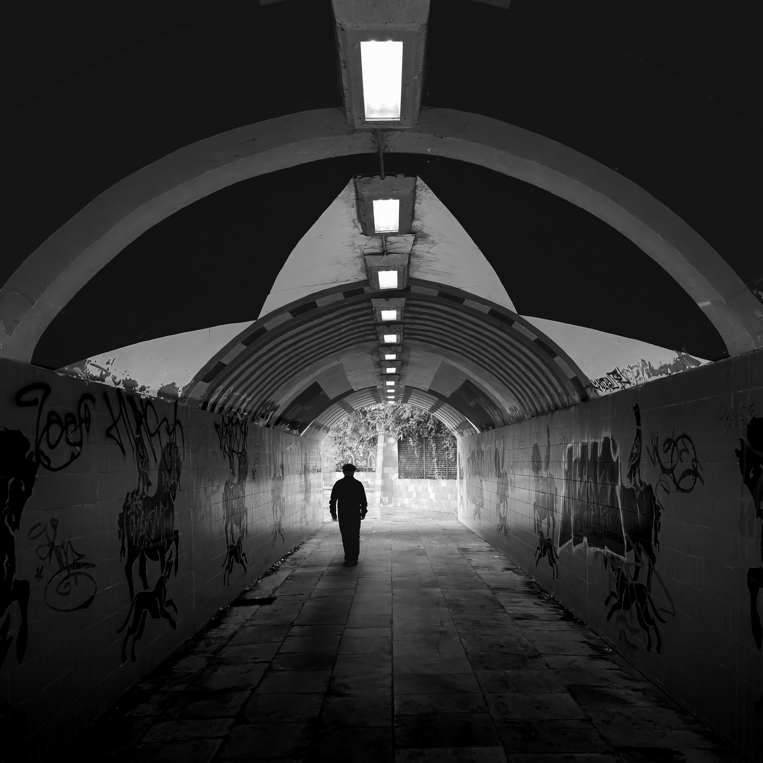 Schwarz-Weiß-Foto, das eine Silhouette einer Person zeigt, die durch einen unterirdischen Tunnel geht und sich dem Sonnenlicht draußen nähert. Die Person trägt eine Baskenmütze und dreht der Kamera den Rücken zu. Die Tunnelwände sind mit Graffiti besprüht. Das kuppelförmige Dach ist von einer Reihe von Lichtern gesäumt und mit geometrischen Mustern bemalt. © Gary Williamson | Sony α7C II + FE 24-50mm f/2.8 G | 1/125s @ f/5.6, ISO 1600