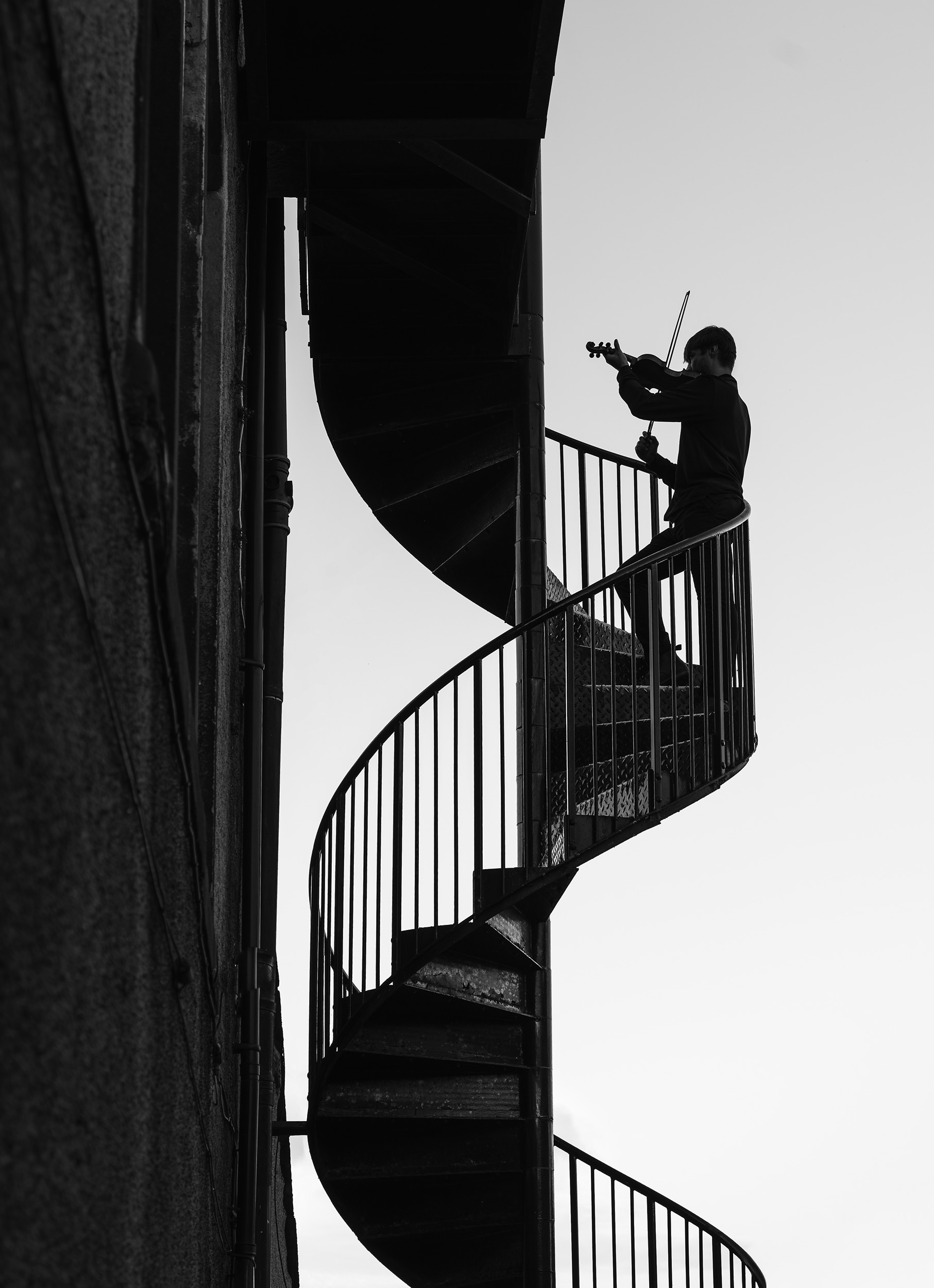 Schwarz-Weiß-Foto eines Mannes, der auf einer dunklen Wendeltreppe steht und Geige spielt. © Gary Williamson | Sony α7C II + FE 20-70mm f/4 G | 1/250s @ f/5.6, ISO 100
