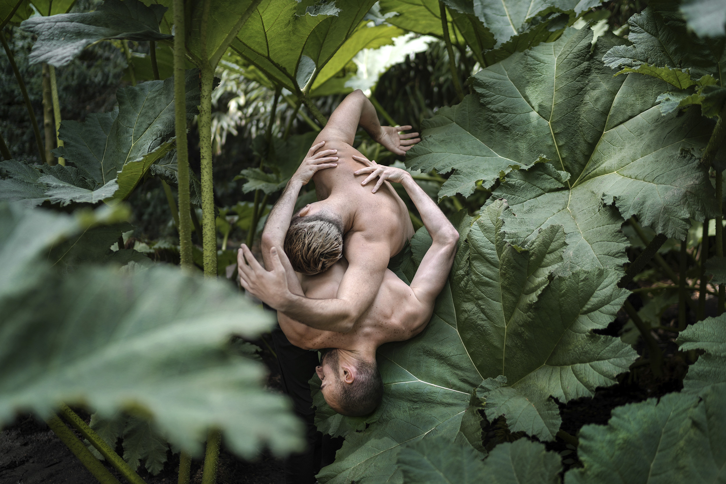 zwei männer posieren kopfüber zwischen farn © Laura Zalenga | Sony α7CR + FE 35mm f/1.4 ZA | 1/500s @ f/1.4, ISO 100