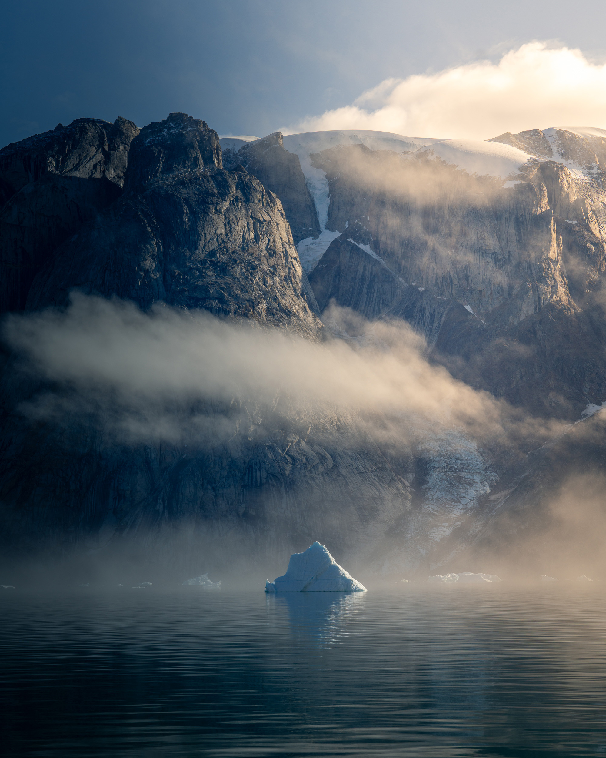 Auch wenn das Fotografieren vom Deck eines Schiffes aus restriktiv erscheinen mag, bietet es laut Tobias viele Möglichkeiten, und es werden auch häufige Ausflüge an die Küste unternommen. „Als Fotograf ist man immer an Deck und versucht, Möglichkeiten zu erkennen. Aber es ist eine lange Reise, also ist Zeit kein Problem, und wenn man etwas in der Ferne erspäht, weiß man, dass man bald dort sein wird. Oder man kann den Kapitän bitten, zu einer Komposition zu navigieren.“ Er sagt weiter: „So hatte ich mir dieses Mal beispielsweise vorgenommen, näher an einige der roten Berge rund um den Fjord heranzukommen, wo man diesen schönen Kontrast zwischen den warmen Tönen der Felswand und den Blautönen des Eises und des Wassers erhält.“ Genau wie das wechselnde Wetter und der ständige Fluss schöner Aussichten entwickelte sich auch Tobias beim Fotografieren des Sunds weiter. „Bei jeder Reise habe ich mich auf einen anderen Aspekt konzentriert“, erklärt er. „Man sieht immer neue Dinge und reagiert auf neue Situationen. Im ersten Jahr begeisterte es mich, den Schoner in der Landschaft zu fotografieren, und ich habe versucht, die Reise im Allgemeinen wie eine Art Lebensstil zu fotografieren, ebenso wie die Natur, an der wir vorbeikamen.“