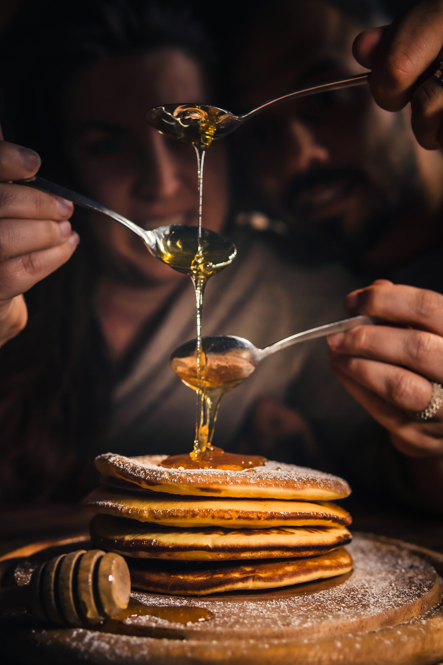 Das Gewinnerfoto zeigt Selene und ihren Partner, wie sie Honig von einem Löffel zum nächsten tropfen lassen, bis er schließlich auf die Pancakes darunter tröpfelt. Es vermittelt eine heimelige und warme Atmosphäre, die weit über die Stimmung eines einfachen Fotos von Honig und Pancakes hinausgeht.