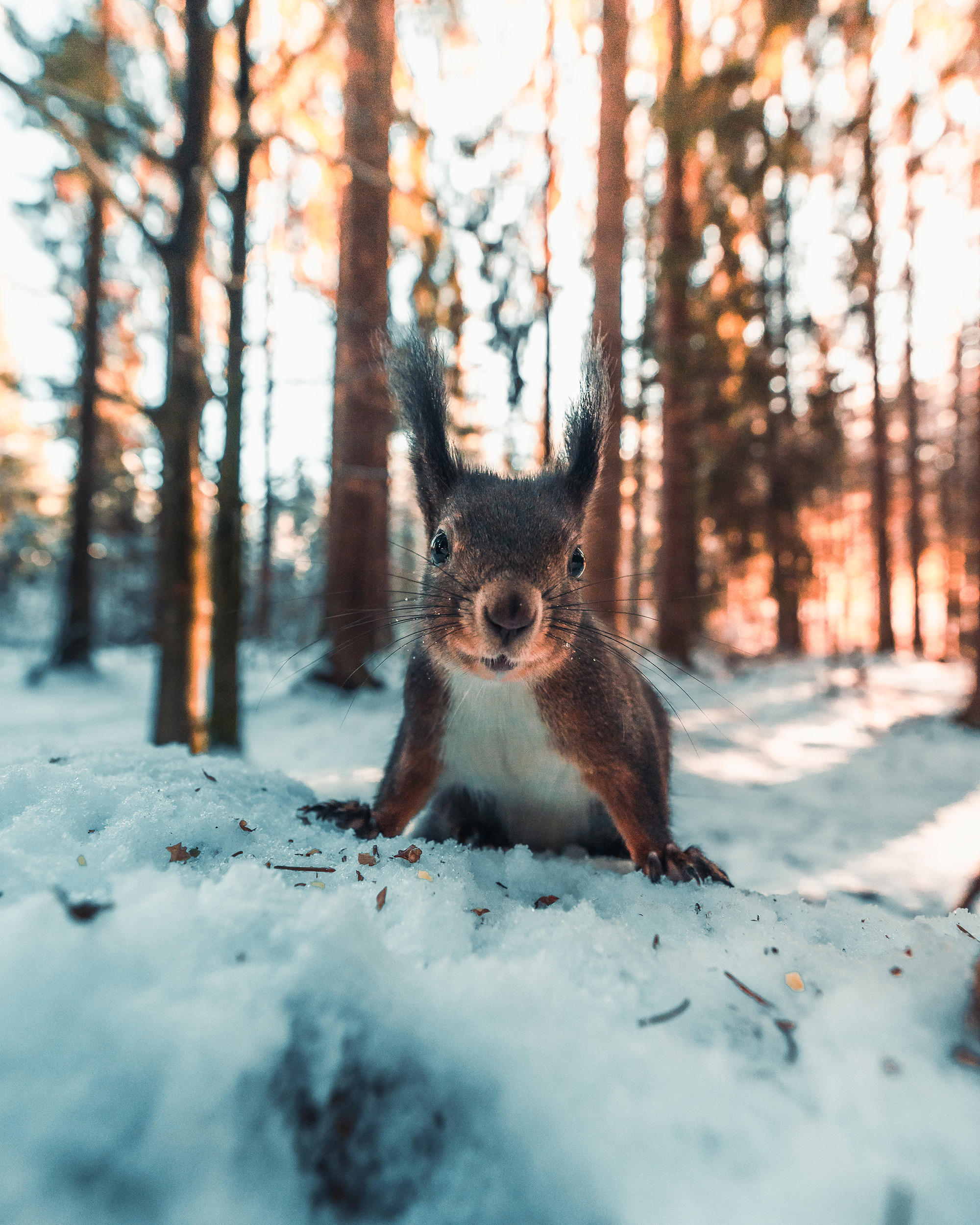 Echtes „Wildlife“ kann man allerdings auch zu Hause erleben: „Bei einem Spaziergang im Wald begegnete mir dieses neugierige Eichhörnchen. Ich hatte zum Glück die passende Kamera dabei, die Alpha 7 IV hat nämlich ein verbessertes Autofokus Tracking, das sogar bei so kleinen Tieren sehr zuverlässig reagiert. So entstand dieses einzigartige Bild spontan, auf dem Heimweg. Für ein gutes Foto braucht man neben gutem Equipment manchmal vor allem eins: Glück, zur richtigen Zeit am richtigen Ort zu sein.“