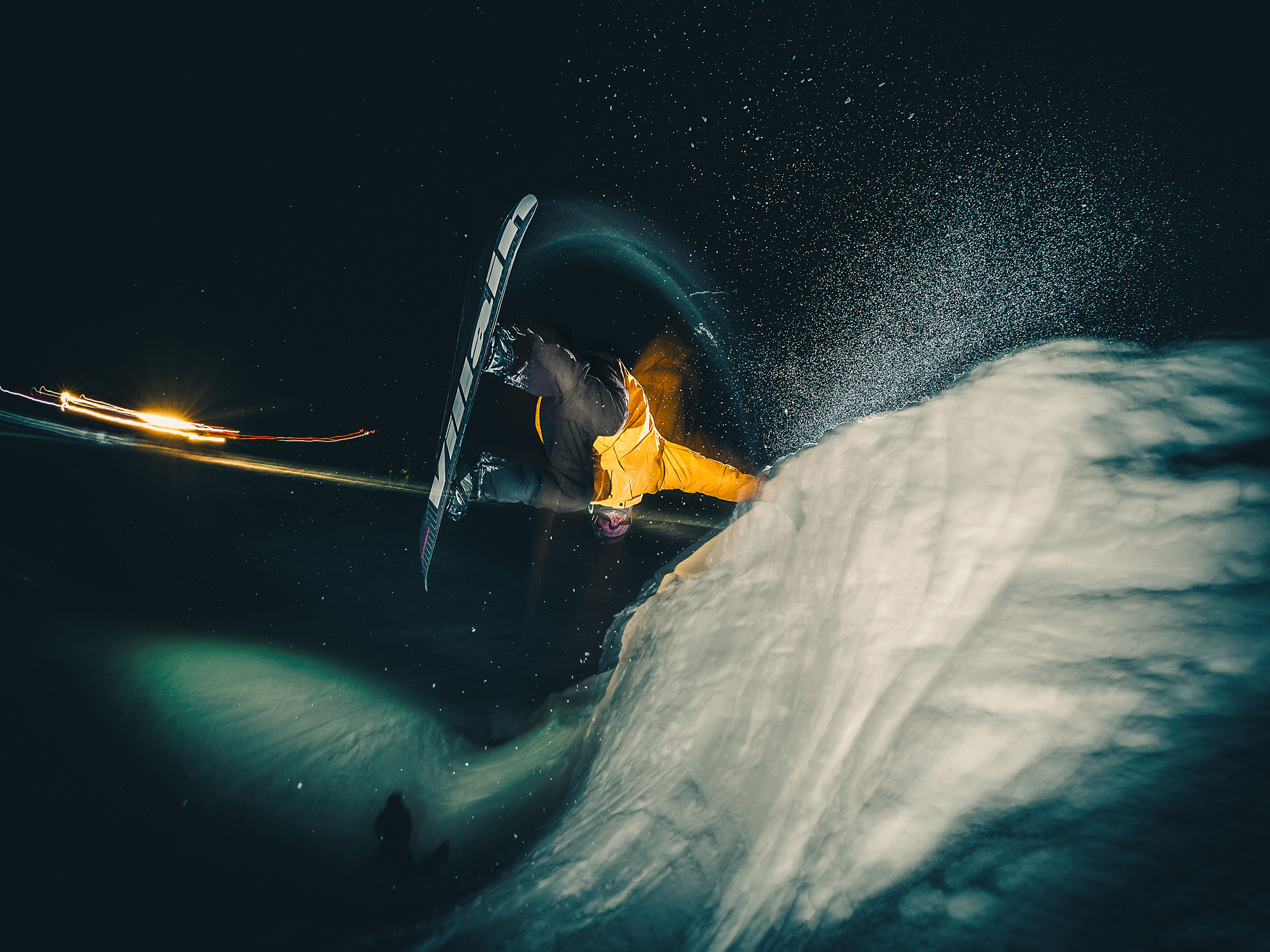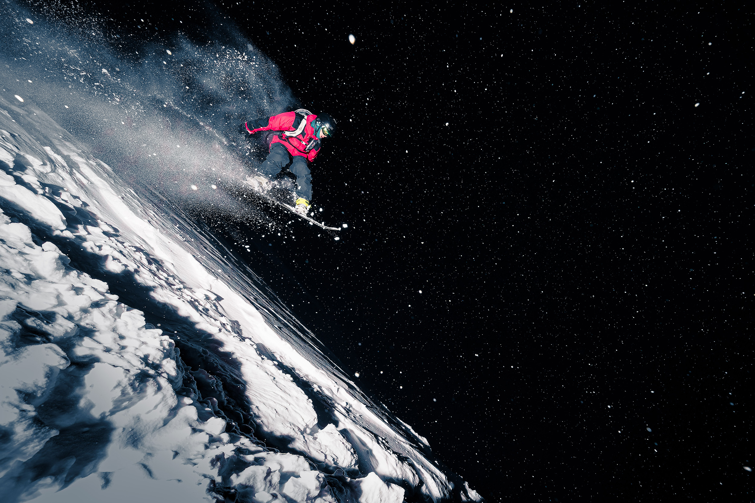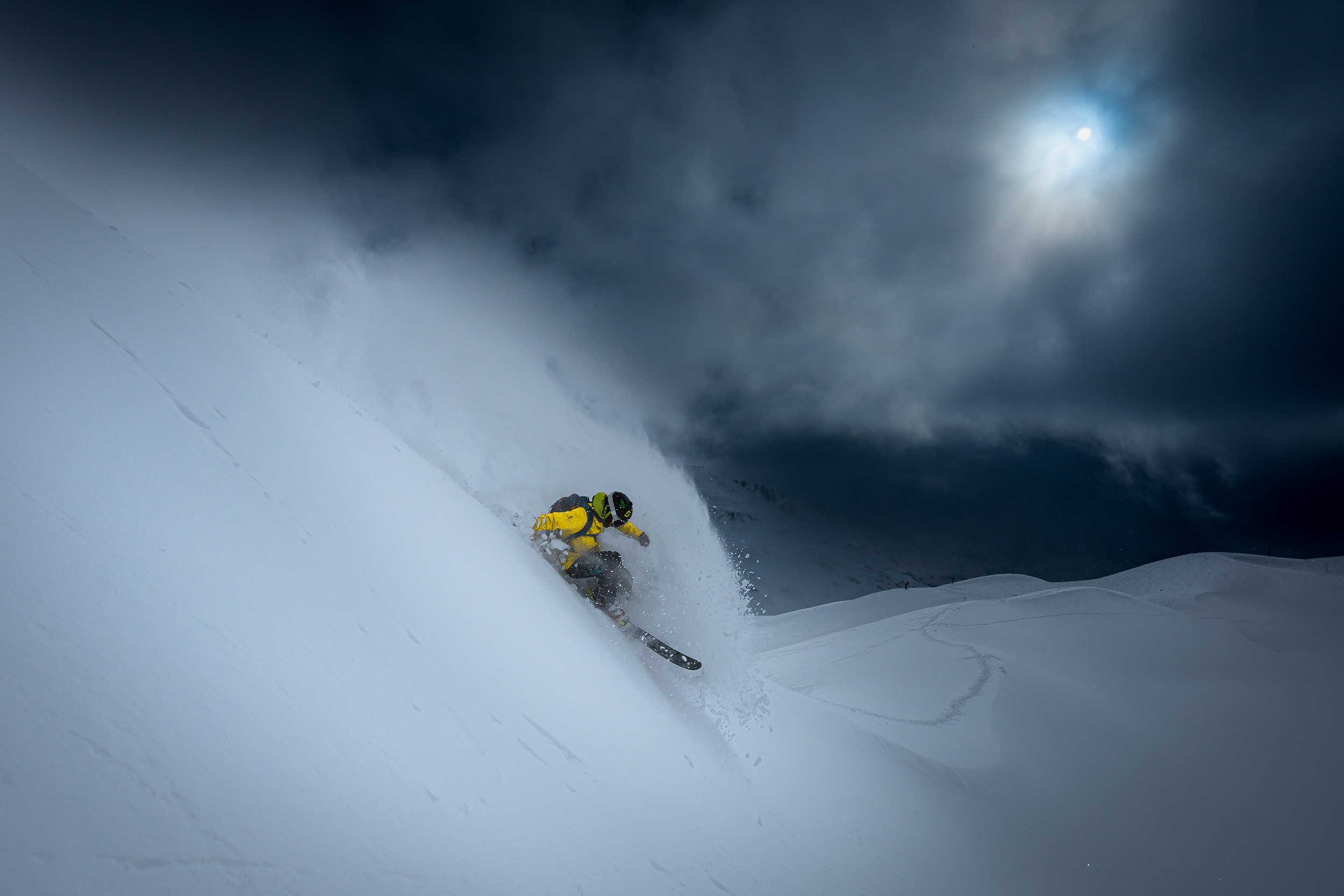 Das heißt aber nicht, dass sich Yhabril von schlechtem Wetter abschrecken lässt. „Schlechtwettertage oder ungünstige Vorhersagen können sich durchaus als optimal erweisen“, verrät er. „Wenn es frisch geschneit hat und die Wolken aufreißen, ergibt sich vielleicht Gelegenheit für ein paar besondere Aufnahmen. Unter solchen Bedingungen fotografiere ich oft mit hoher Geschwindigkeit, um die Bewegung einzufrieren, und unterbelichtet, um einen Kontrast zwischen Licht und Schatten zu erzielen, der dem Bild Dramatik verleiht, während ich gleichzeitig einen starken Blitz verwende, um den Skifahrer hervorzuheben.“