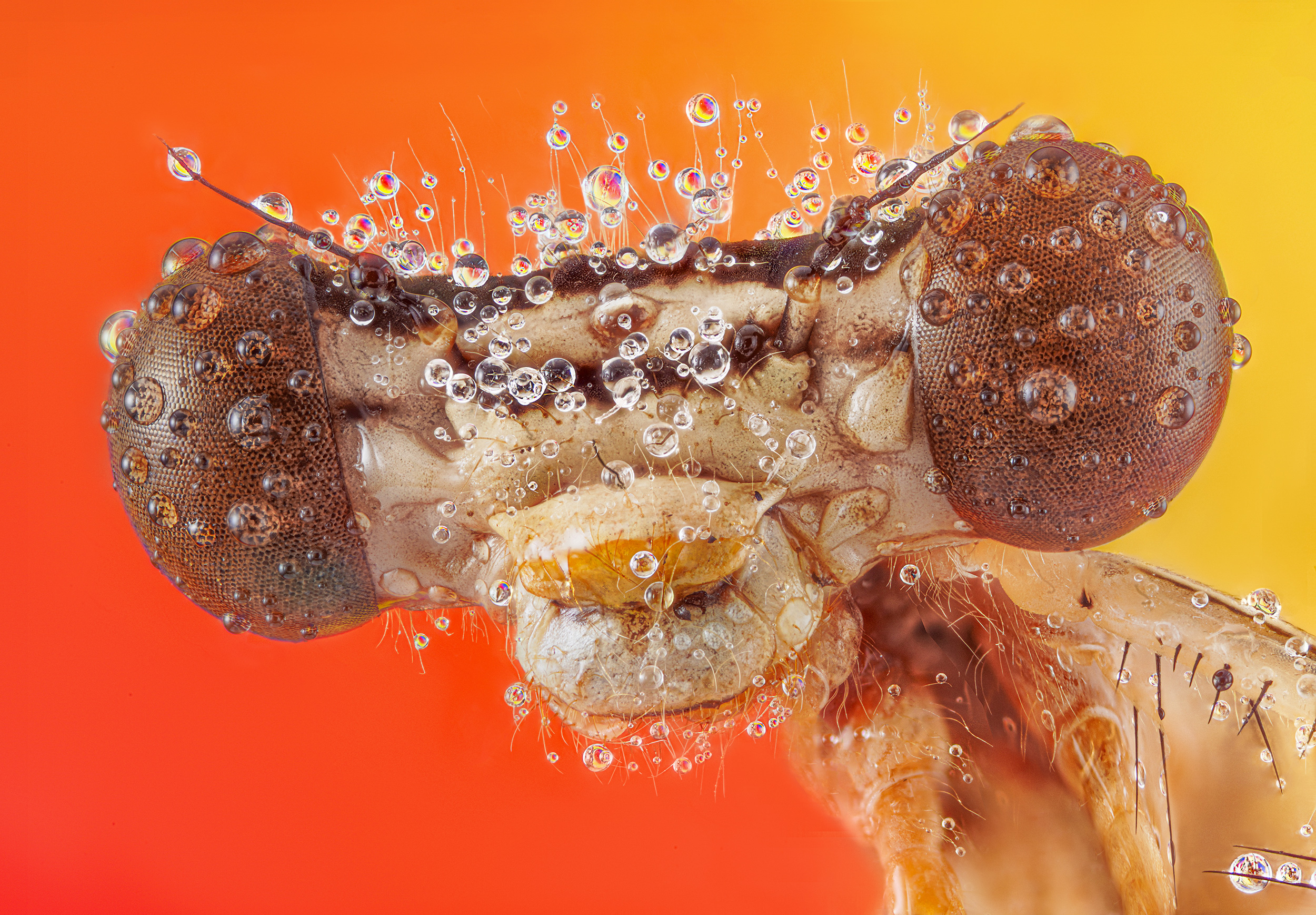 „Das Bild wurde im Juli dieses Jahres an einem ziemlich kühlen Morgen in einer relativ schattigen Umgebung aufgenommen. Libellen können stundenlang bewegungslos an einer Stelle sitzen, um sich in der Sonne aufzuwärmen, insbesondere dann, wenn sie gerade aus ihrer Larvenhaut geschlüpft sind. Dadurch hatte ich Zeit, eine Art ‚tragbares Studio‘ mit Lichtplatten und Reflektoren vorzubereiten. Für dieses Bild habe ich einen Fokus-Stack aus 30 Bildern mit unterschiedlichen Fokuspunkten erstellt. Für all dies habe ich eine Sony α7R IV, ein Objektiv mit einer Brennweite von 35 mm und einem Satz elektronischer Fokusschienen verwendet.“
