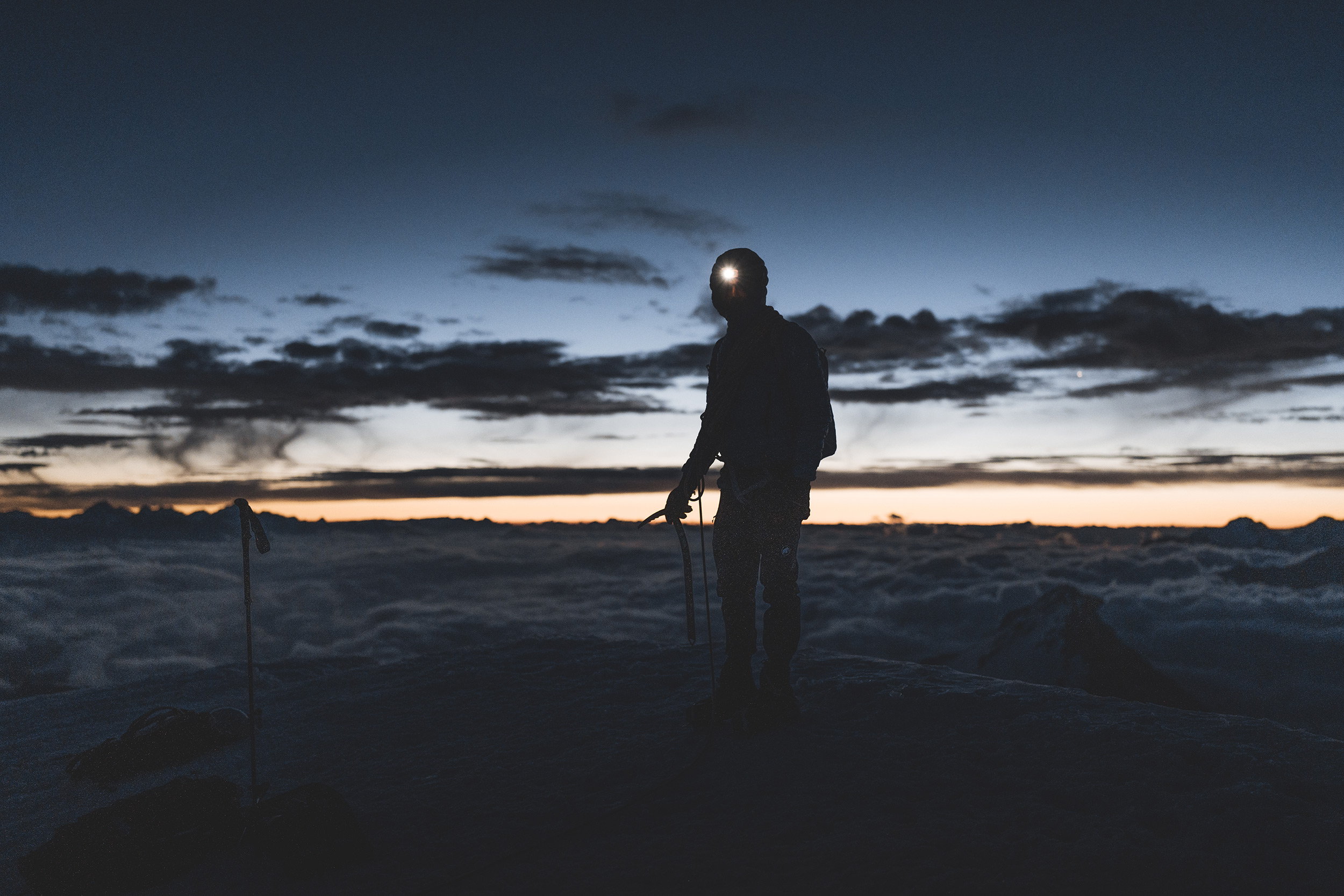 person mit stirnlampe steht im morgengrauen auf einem berggipfel © Joni Hedinger| Sony α7 IV + FE 35mm f/1.4 GM | 1/60s @ f/1.6, ISO 1600