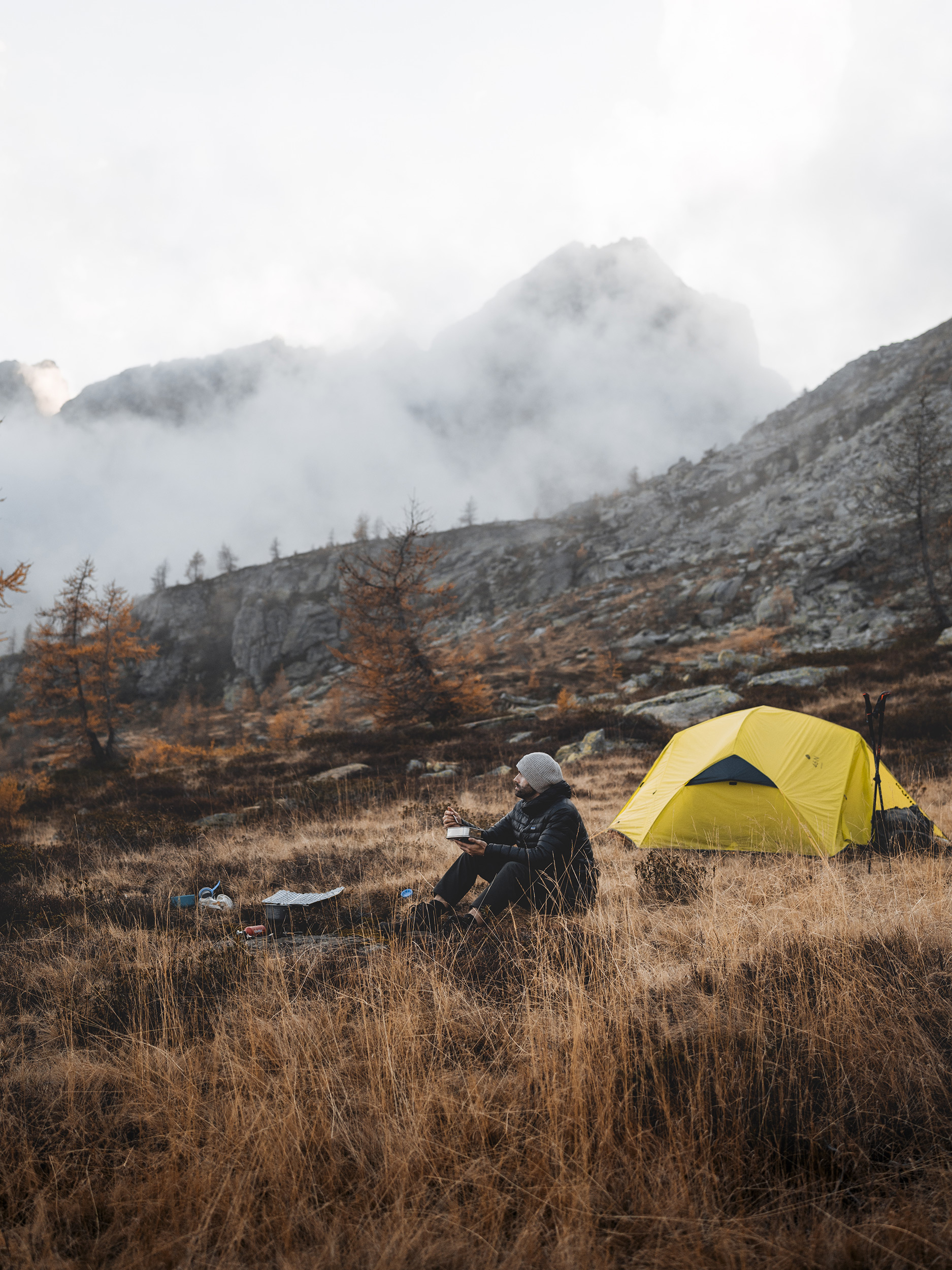 mann sitzt in einer berglandschaft vor einem zelt © Joni Hedinger| Sony α7 IV + FE 35mm f/1.4 GM | 1/400s @ f/2.8, ISO 100