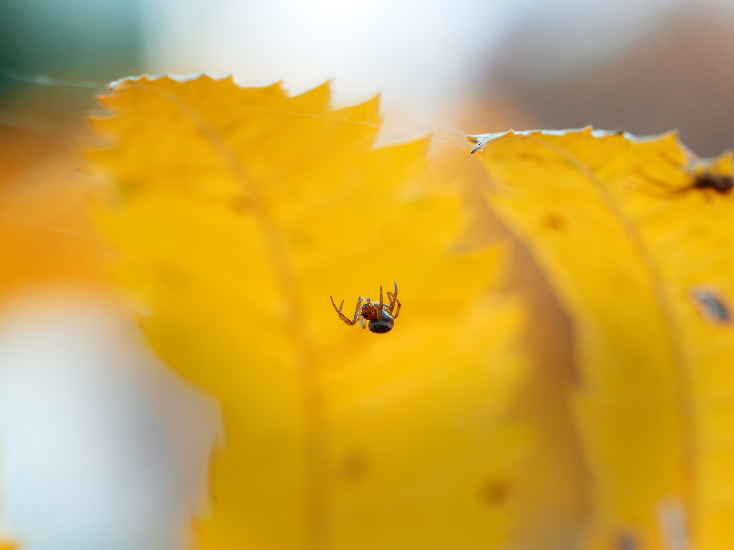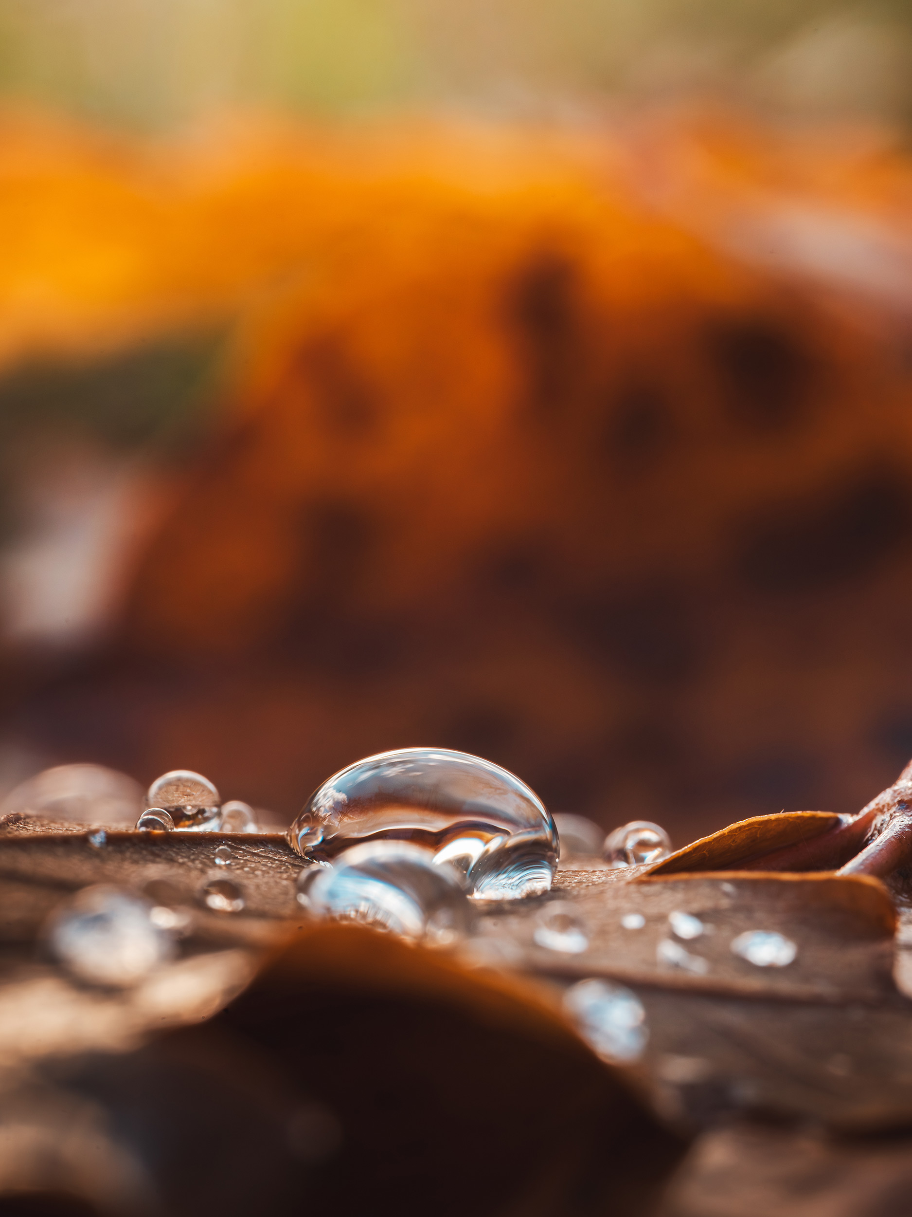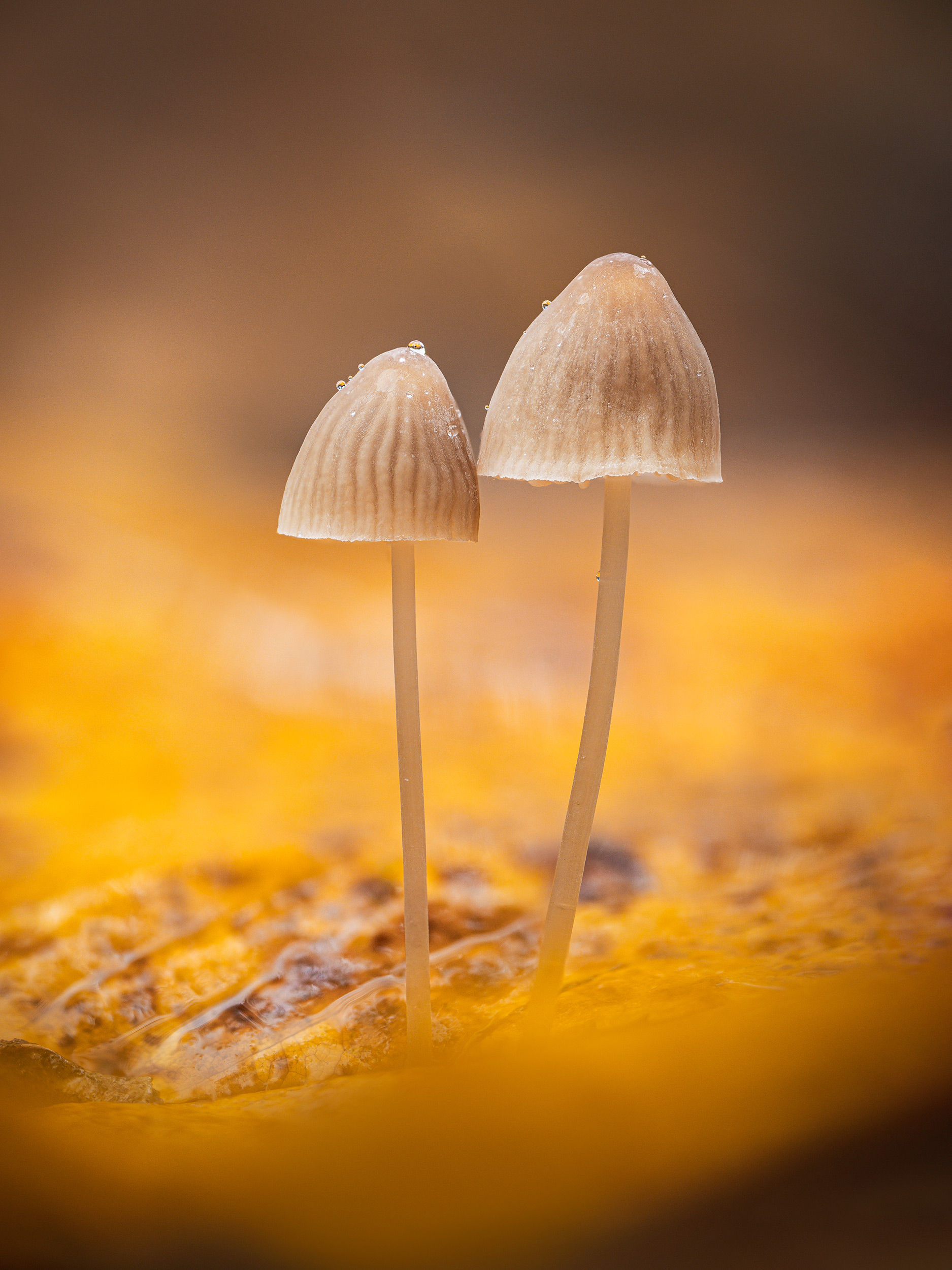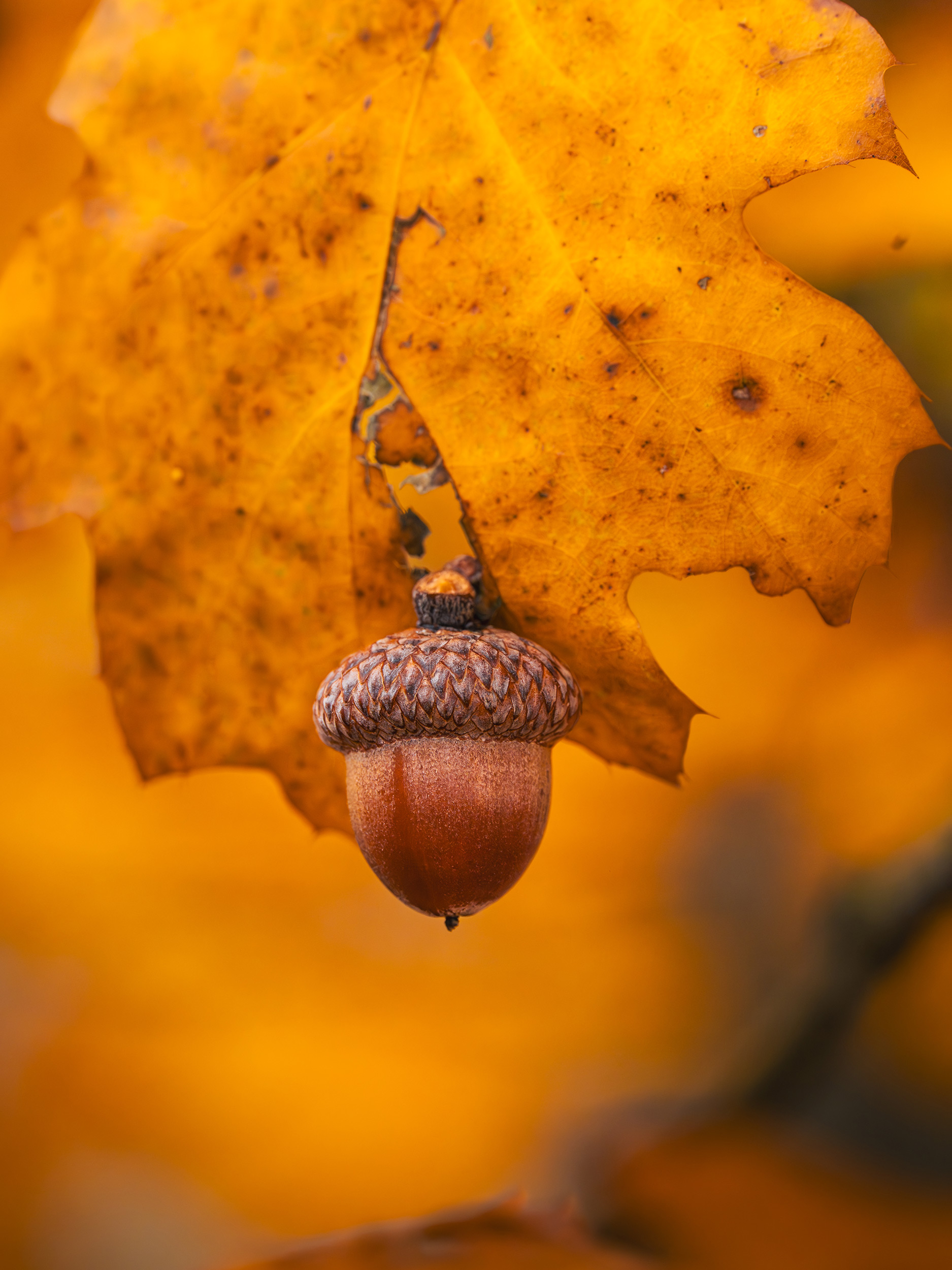 Durch die Telekonverter bekam ich noch mehr Möglichkeiten. Mit dem 1,4-fach Telekonverter fotografierte ich Pilze, winzige Lärchennadeln, eine Spinne, die durch Herbstlaub krabbelt, und Regentropfen auf einem heruntergefallenen Blatt. Jedes Motiv erschien größer und detailreicher, ohne dass ich es stark zuschneiden musste. Der 2-fach Telekonverter ermöglichte mir extrem nahe Ansichten, zum Beispiel den Fokus-Stack des Eichelhütchens. Ich habe mit ihm auch noch andere Details der Eicheln mit starker Vergrößerung eingefangen. Und wenn ich die Kamera auf den Boden stellte, blieb alles stabil, während ich mit f/5.6 fotografierte, der größten Blende, die für den 2-fach Telekonverter verfügbar ist. Die Ergebnisse waren sehr scharf und voller Textur. Diese Kombination wird im Sommer besonders beim Fotografieren scheuer Insekten nützlich sein. Denn man kann Aufnahmen machen, die das Bild ausfüllen, ohne zu nah heranzugehen und zu riskieren, die Tiere zu verscheuchen. Das Herbstlicht ist zwar oft nur begrenzt verfügbar, aber dank des Objektivs erhielt ich auch bei überraschend schwachen Lichtverhältnissen sehr gute Ergebnisse. Ich habe beispielsweise scharfe handgeführte Bilder mit 1/100 Sekunden, 1/40 Sekunden und sogar mit 1/13 Sekunden aufgenommen. Außerdem habe ich einen handgeführten Fokus-Stack mit 15 Bildern bei 1/20 Sekunden erstellt. Die Ergebnisse mit diesen Verschlusszeiten haben mich wirklich überrascht. Ich hatte in dieser Jahreszeit bereits ein wenig fotografiert und dachte, es sei genug. Aber nachdem ich das Objektiv bekommen hatte, wollte ich es sofort ausprobieren und die Szenen aus diesem Herbst noch um einiges erweitern. Ich bekam schnell Lust, mehr zu erkunden, länger zu wandern und dabei langsamer zu werden, um auch die kleineren Dinge zu schätzen. Ich begann nach Motiven zu suchen, die ich sonst vielleicht übersehen hätte. Ohne das Objektiv hätte ich den Miniaturpilz, das goldene Sonnenlicht auf dem Waldboden, die detailreichen Eicheltexturen oder die vielen stillen Szenen, die sich unter den Blättern verbergen, nicht einfangen können.