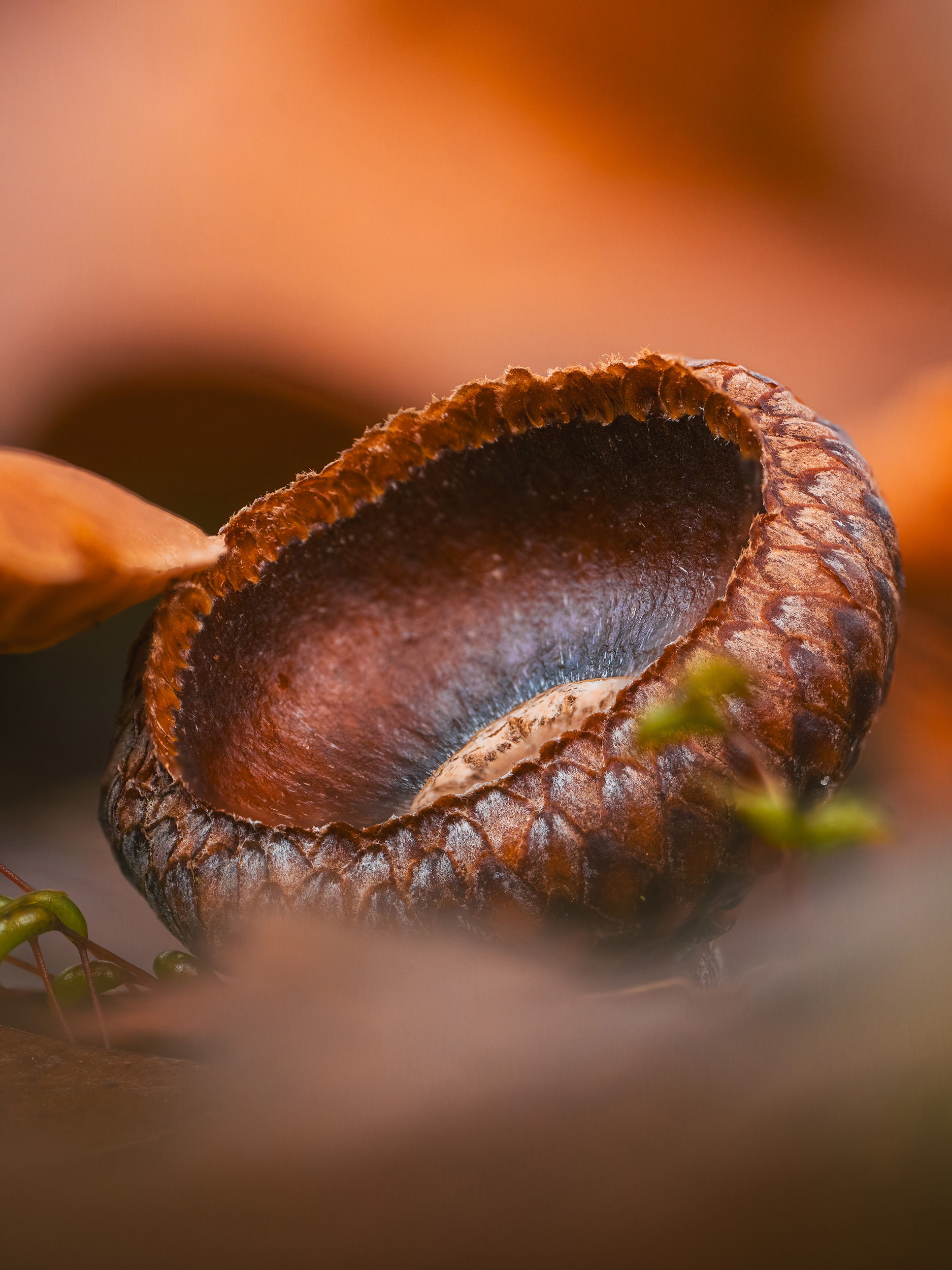 Als ich das FE 100mm f/2.8 Macro GM OSS zum ersten Mal in die Hand nahm, fiel mir zuerst sein geringes Gewicht auf. Ich hatte ein schwereres Objektiv erwartet, vor allem, weil es auch ohne Telekonverter Vergrößerungsraten von über 1:1 von bis zu 1,4:1 erreichen kann. Stattdessen kam es mir ungefähr so schwer vor wie mein 90-mm-Makroobjektiv. Der gummierte Fokusring war eine zwar kleine, aber erfreuliche Verbesserung, da sich das Objektiv dadurch bei kälterem Wetter angenehmer anfühlt. Positiv war auch der vertraute Rückziehmechanismus zum Umschalten in den manuellen Fokus und die beiden programmierbaren Tasten. Sie waren unabhängig von der Ausrichtung, in der ich fotografiert habe, leicht erreichbar. Bezüglich der Bildqualität lieferte das Objektiv die erwartetet Klarheit und Detailgenauigkeit. Die Schärfe war ausgezeichnet, und das auch bei einem Zoom von 100 %. Am meisten beeindruckte mich dabei, wie konstant scharf die Bilder selbst bei schwierigen Lichtverhältnissen oder stärkeren Vergrößerungen waren. Ein Beispiel dafür ist ein Fokus-Stack mit 45 Aufnahmen eines kleinen Eichelhütchens. Bei Verwendung des 2-fach Telekonverters füllte das Eichelhütchen bei nahezu vollständiger Fokussierung das gesamte Bild aus. Nach dem Stapeln der Bilder wirkte das Endergebnis dann wie eine Miniatur-Landschaft aus der Perspektive einer Ameise. Die winzigen Rillen und Texturen kamen auf eine Weise zum Vorschein, wie ich sie noch nie zuvor eingefangen hatte. Es war faszinierend zu sehen, wie sich ein so scheinbar einfaches Objekt in etwas so Detailreiches und Komplexes verwandeln kann.