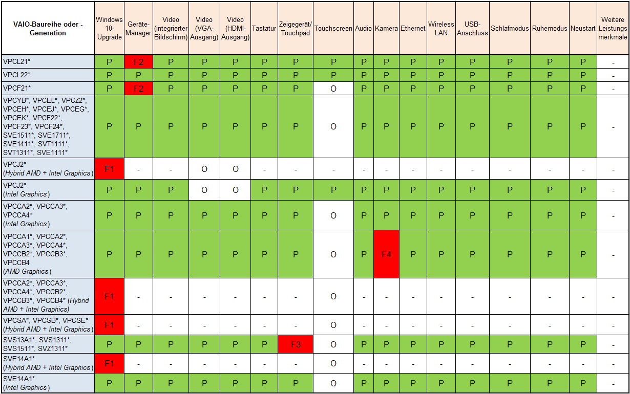 Wie bereits angekündigt, plant Sony nicht, spezielle Treiber für Windows 10 für Ihren VAIO-Computer bereitzustellen. Bitte beachten Sie, dass die nachfolgenden Kompatibilitätsinformationen nur als Referenz dienen, und dass Sony im Falle eines fehlgeschlagenen Upgrades auf Windows 10 nicht verantwortlich gemacht werden kann, wenn Sie entscheiden, das Upgrade durchzuführen.
