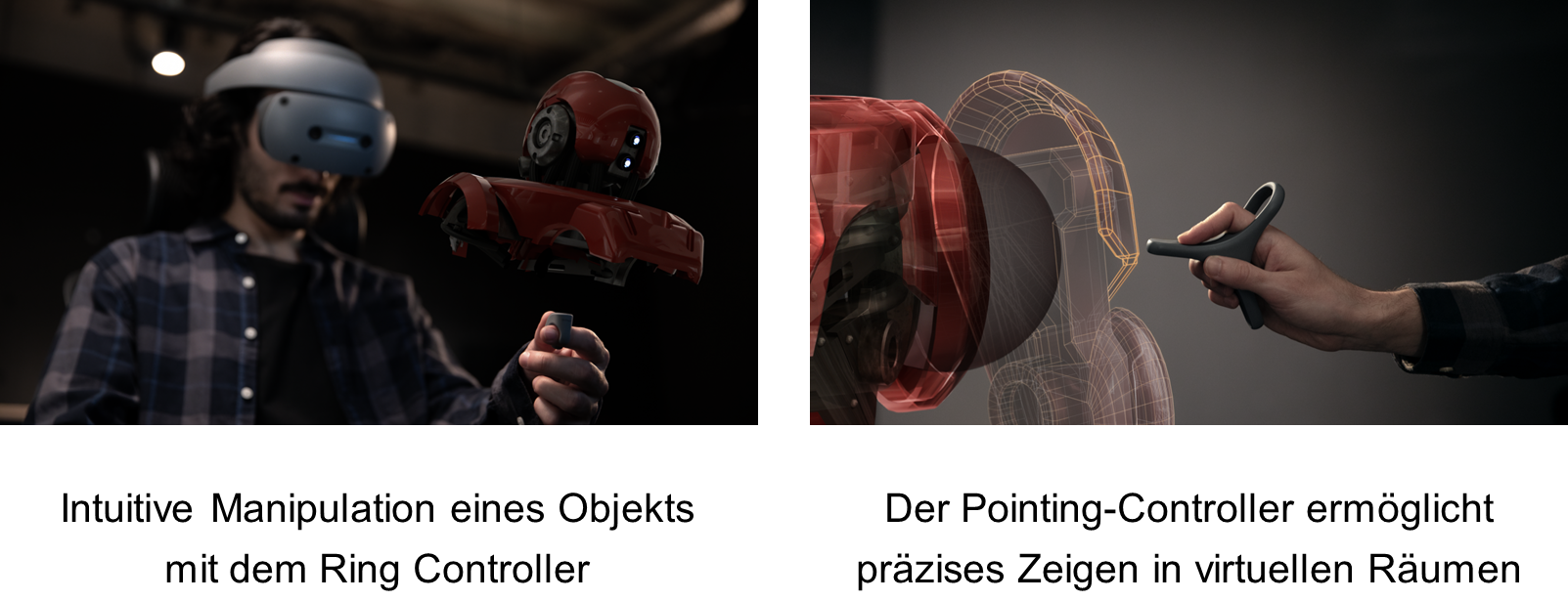 Zum System gehört ein Ring-Controller, mit dem die Benutzer*innen Objekte im virtuellen Raum intuitiv bewegen können. Außerdem ist ein Pointing-Controller vorhanden, der stabiles, genaues Zeigen im virtuellen Raum ermöglicht und hinsichtlich Form und Tastenlayout für eine effiziente und präzise Bedienung optimiert ist. Wenn die Benutzer*innen das Head-Mounted Display tragen, den Pointing-Controller in der Führungshand halten und den Ring-Controller an den Fingern der anderen Hand anbringen, können sie mit den beiden Controllern und einer Tastatur 3D-Objekte modellieren.